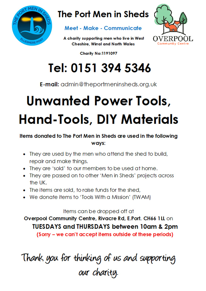 A Men in Sheds project originally established in 2010 under the management of Age (UK) Cheshire and now under the full control of 'The Port Men in Sheds' Charity